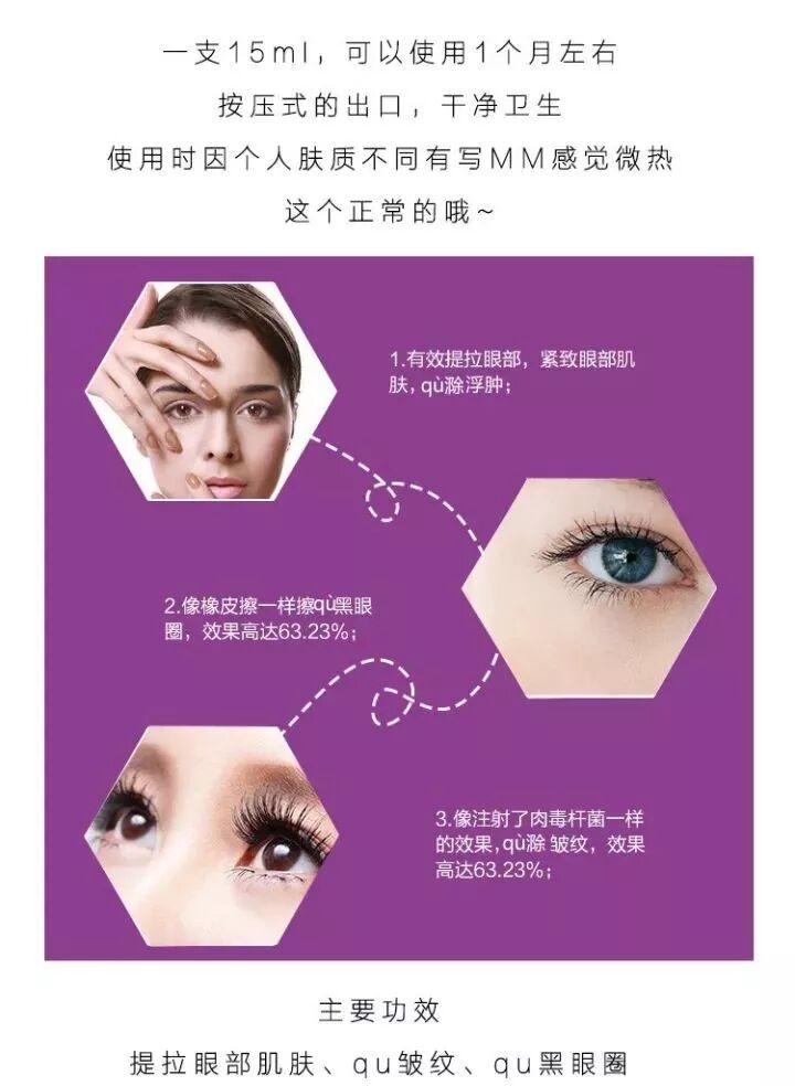 1.有效提拉眼部,紧致眼部肌肤,去除浮肿;
