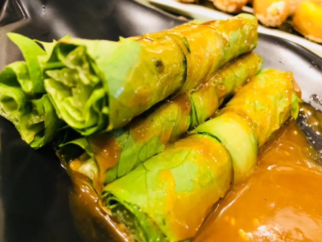 天妇罗虽然被酱汁淋得微微湿润,但还是很酥脆,香而不腻,咬开就看到翠绿翠绿的蔬菜,把你胃里的任何一丝空隙全部补上!