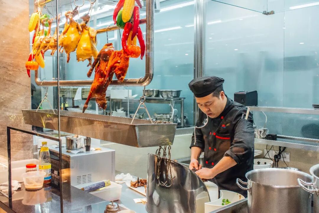 操作案台干净没有油污,各种用具也都十分整齐清洁,厨师现场烹饪菜肴,看着都食欲大增