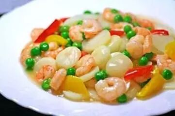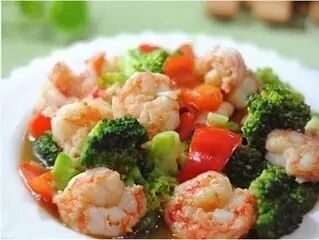 3、原锅留下1汤匙的油,开大火,放入蒜头爆香,加葱、辣椒及虾炒大约1分钟,再放入海盐炒至均匀即可上桌。