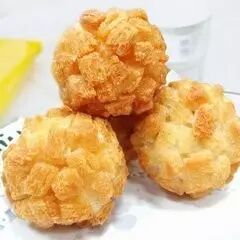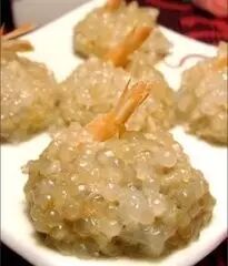 5、用不锈钢勺将虾茸一一舀成丸子,再裹上面包丁成虾球坯。