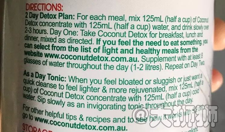 看下用法说明,2天减肥法是,用椰子水代替早中晚饭!也就是说,你每顿饭就喝这水(一顿饭喝125ml)别吃东西(如果实在有需要吃官网上建议的那些)!不过估计能有这种毅力的人不多吧?但是还有第二种用法是比较平和一点的,也就是说,每天喝125ml,你想起来就喝没什么硬性规定,喝完就行。