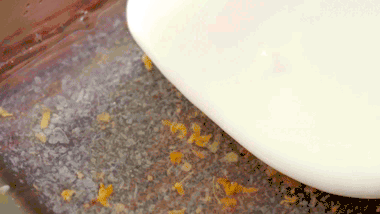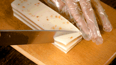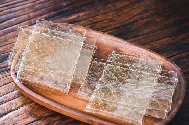1、40g吉利丁片对半剪开,平均分为两份,每片交叉叠放于装有冰水的碗中(以免浸泡过后黏连在一起),浸泡3-5分钟至其变软。