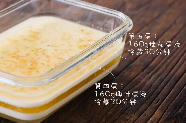 5、取出倒入160g椰汁液,作为第二层,放入冰箱冷藏30分钟;取出再倒入第三层160g桂花液,入冰箱冷藏30分钟。第四、第五层重复上面的步骤。