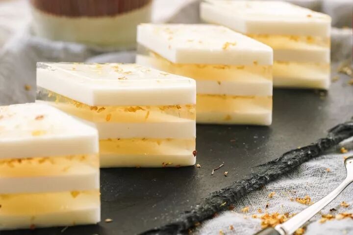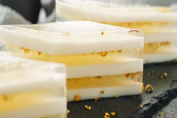 6、最后倒入160g椰汁液,作为第六层,放入冰箱冷藏1小时后,将模具倒扣在案板上,用热毛巾包裹模具底部和四周,焐2分钟左右让桂花糕自然滑落。
