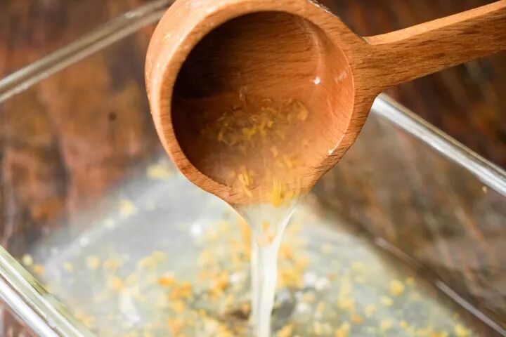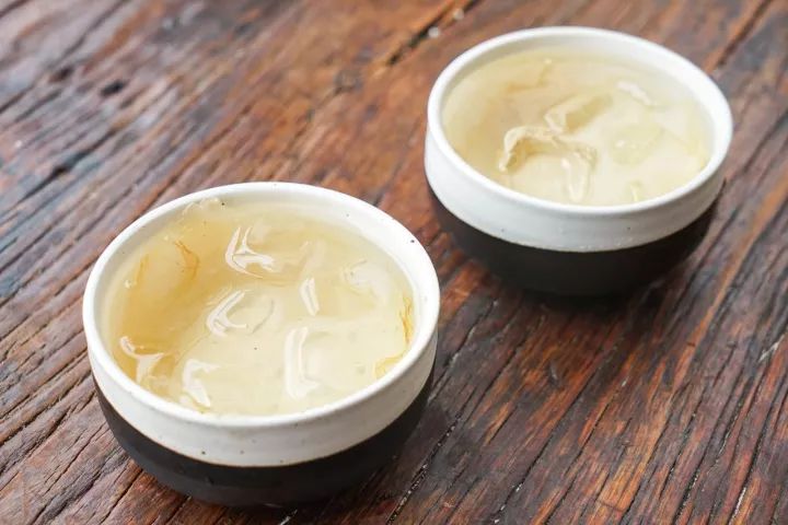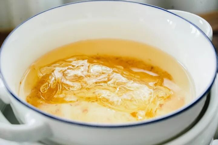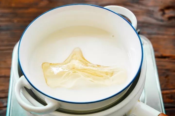 3、桂花层做法:90g糖桂花、350g纯净水混合拌匀,放入已泡软的20g吉利丁片,中火隔水加热搅拌至吉利丁融化,放置一旁冷却至常温,备用。