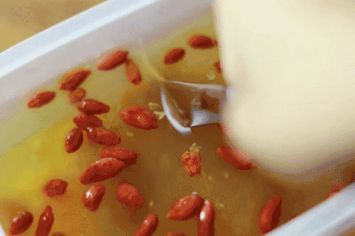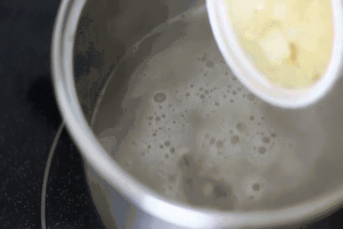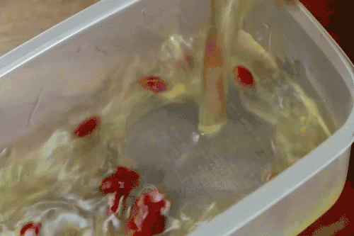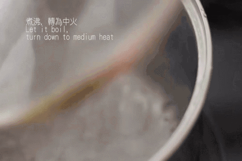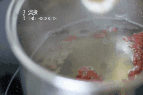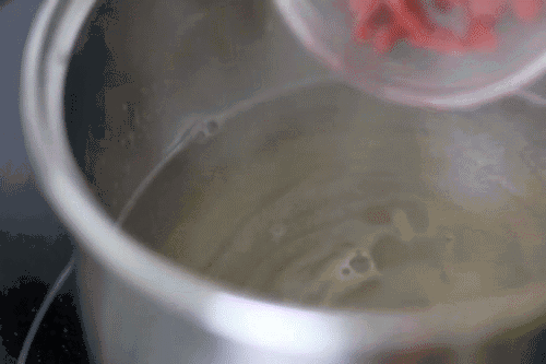 3. 锅中倒入清水,煮沸,转中火,依次放入鱼胶粉,冰糖,搅拌至溶解。