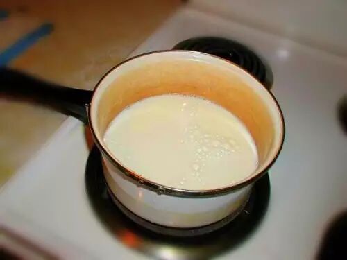 将椰浆、淡奶油、白砂糖放入锅中加热,待砂糖溶化后,加入一半吉利丁粉液体,搅拌至无颗粒,即可熄火。