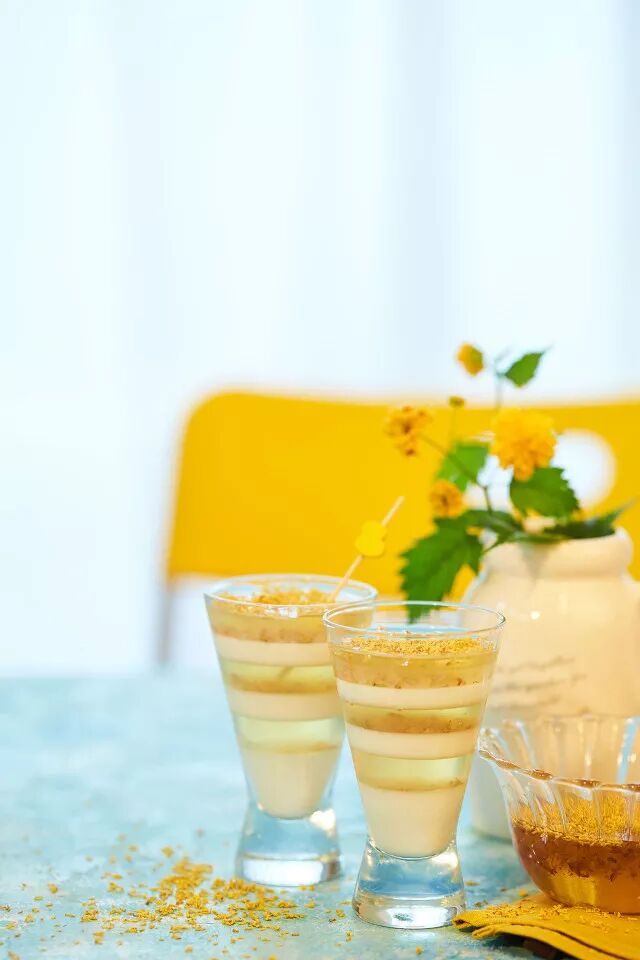 10)如此重复,将两种混合液交替注入,各两或三层,保证最表面一层为桂花液,最后放入冰箱冷藏。