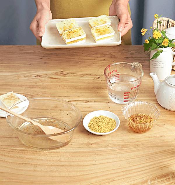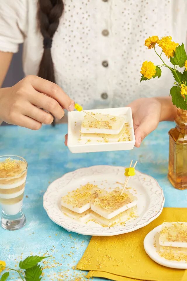 11)待完全凝固成型后取出,脱模切块,淋上浓郁的糖桂花即可品尝。