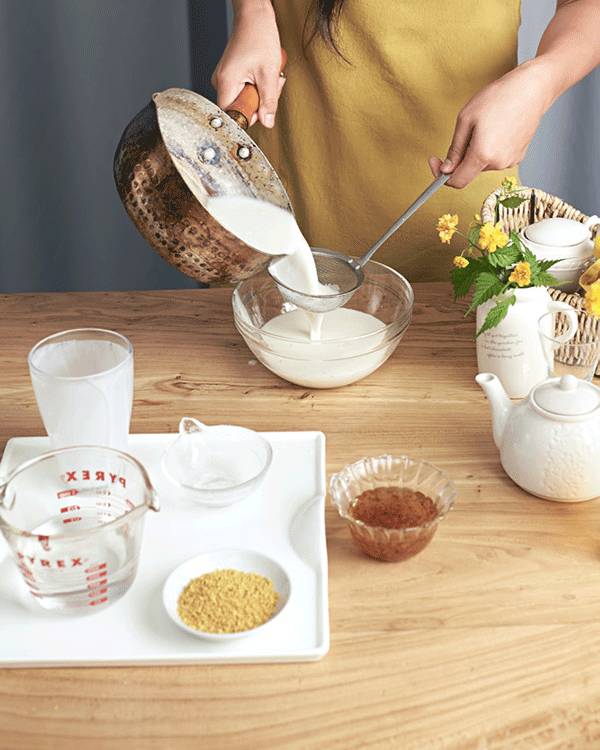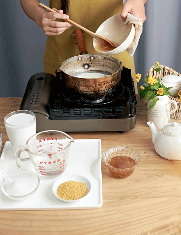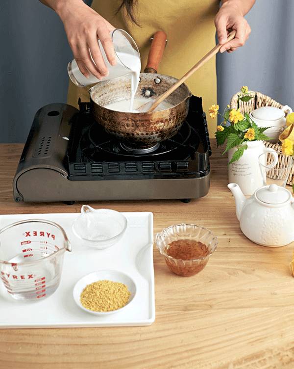 3)牛奶稍加热至冒小泡,加入吉利丁液搅拌,直到完全融合。