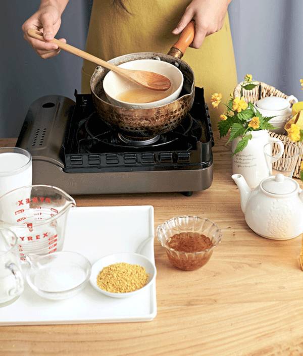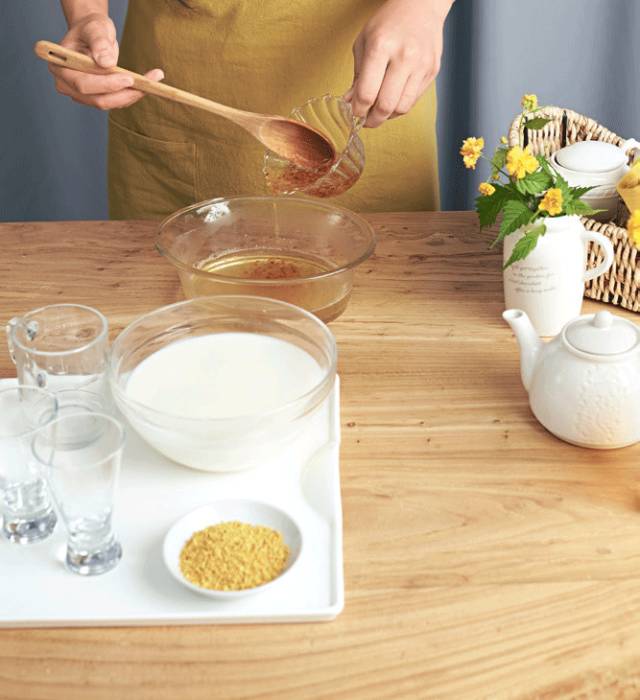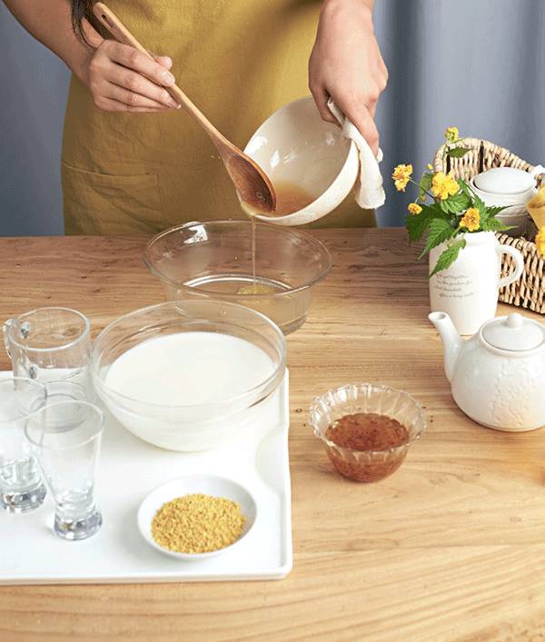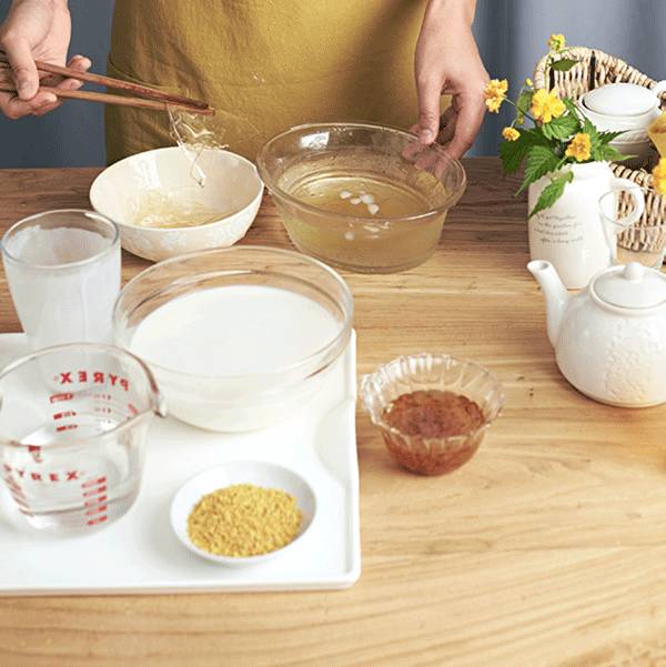 7)将糖桂花加入热水中搅拌,再倒入凉开水,混合后静置备用。