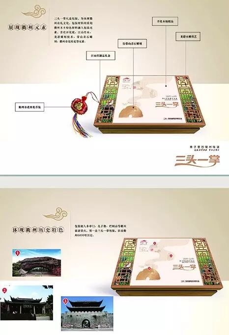 商品简介:“三头一掌”,不仅是衢州美食,更代表着一种文化、一种情怀,已经深深融入到衢州大街小巷的骨子里。为体现衢州有礼文化,公司新推出 “三头一掌”衢州有礼包装,包装材料均采用衢州本土特色材料,含有开化纸、江山竹木、龙游雕刻技术、常山青石雕刻、衢州市花桂花等元素,融入水亭门、孔子像、烂柯山等,用一盒三头一掌包装,讲诉衢州6000年历史。