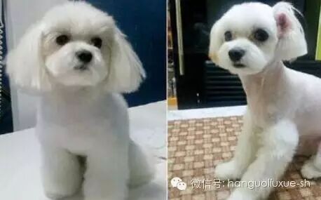 一只宠物狗整容前(左)和整容后(右)。