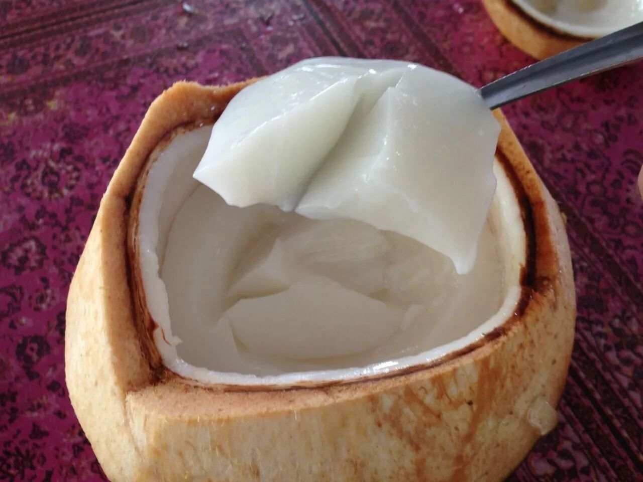 上个月买了几个泰国矮种椰子,果肉爽滑香甜,轻轻一挖凝脂般的果肉就滑落下来,糯糯的。