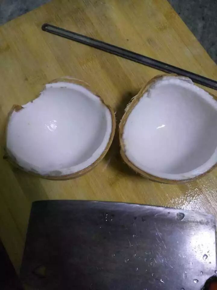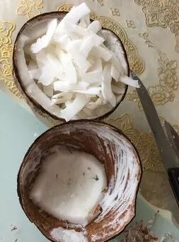 椰汁吸光或倒空后,再用锤子敲开,或将椰子在地上敲裂,就可以用小刀将美味的椰肉剥出了。