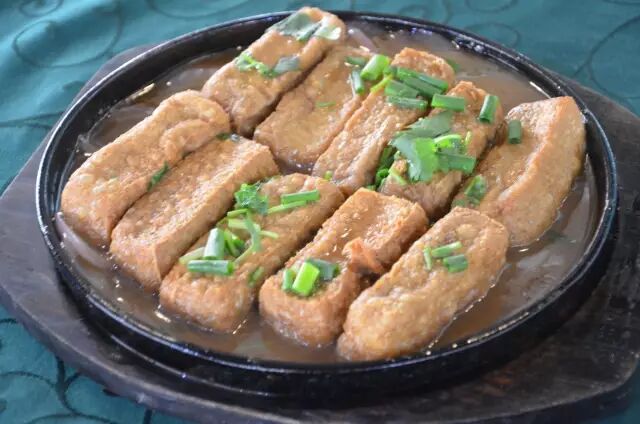 你一定想不到,整桌菜最先光盘的竟然是它!可能因为它上得早吧...不不不,主要因为味道好!黑豆养生已经得到大家共识,但是将自家制的黑豆腐放在铁板上烧,刚吃的时候本以为会比较“糙”,但是当你一咬开,豆腐条的中间依然保持着嫩滑的口感,根本就不用动用牙齿..你说,这么滑溜溜的豆腐,大家能不喜欢吃吗?