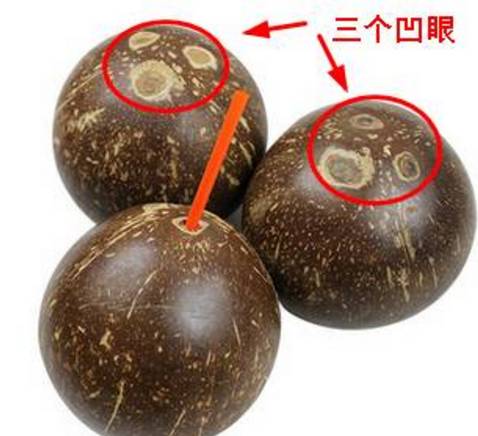 椰子一般都是有“眼”的哦,如下图所示“三个凹眼”: