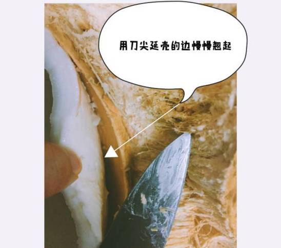 “对付”中青一族的椰子,你就需要用到小刀了,要沿着壳的边缘,慢慢用刀翘起来(如下图)。