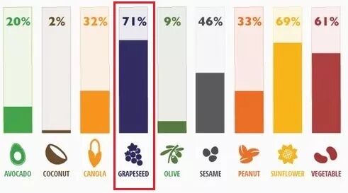 葡萄籽油有着高达71%的多不饱和脂肪酸,17%的单不饱和脂肪酸以及12%的饱和脂肪酸。数据上看起来还不错,但是,目前还没什么针对葡萄籽油在心脏保护方面的研究。