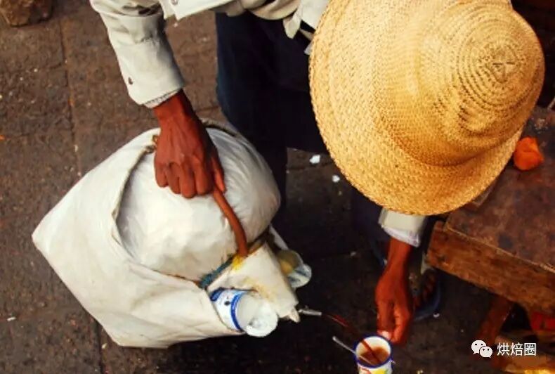 图为街头的咖啡摊,味道还不错,但比较恐怖的是顾客用过的杯子他只用清水涮一下就给下一个顾客用了。