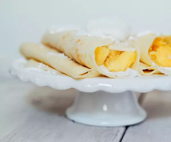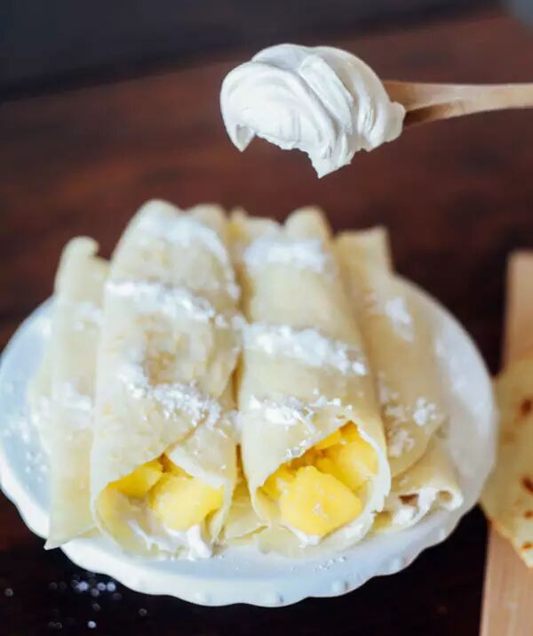 6. 最后将薄饼卷起来就完成了,在许多薄饼叠起来的最上方可以撒上剩余的椰蓉和奶油,椰奶是脂肪含量最低的奶油,所以不用担心会长胖。