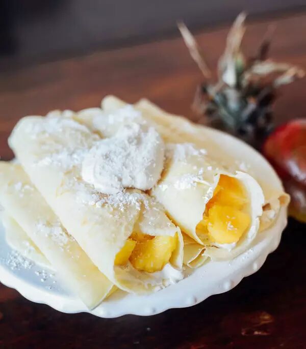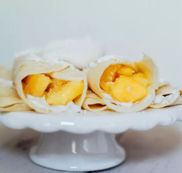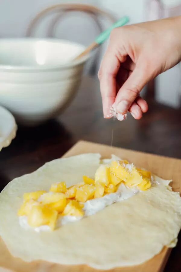 这样一盘美味的椰子口味奶油薄饼就诞生了,椰子奶油不长胖,还有热带水果菠萝和芒果,整个夏天的味道就含在嘴里了!