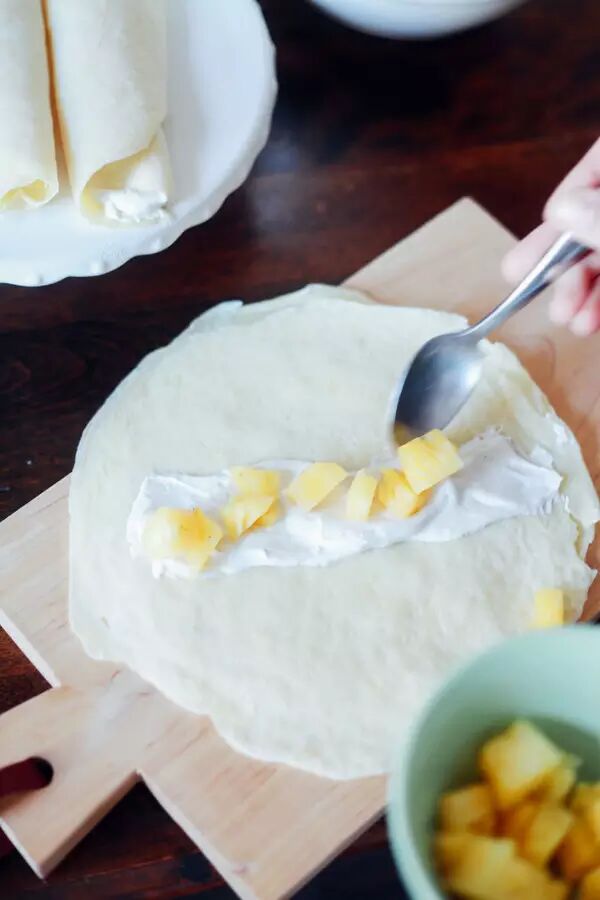 4. 在可丽饼中间,抹上奶油,长长的、薄薄的一条就好,在奶油上铺上一层菠萝和芒果。