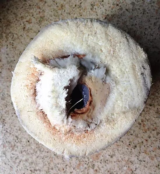 ❶ 沿着黑线(椰子的底部)切下去,切掉一层。