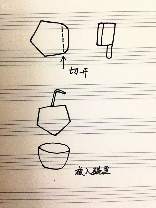 ❹ 头部尖尖的不好拿没关系,放在碗里,插上吸管,开喝。