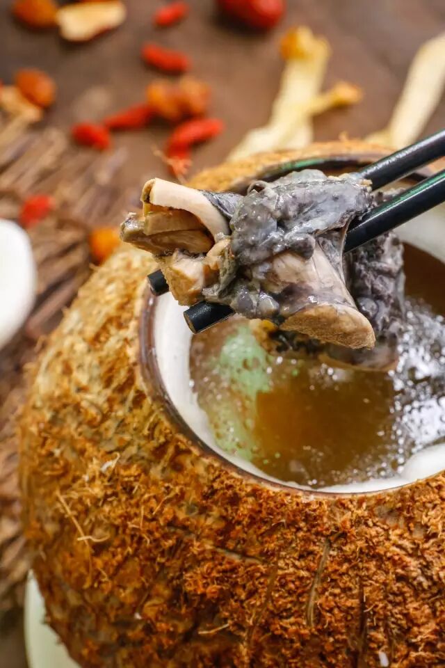 椰子肉白皙软糯,新鲜乌鸡肉嫩滑紧实,而且蛋白质非常丰富,确实是一道滋补靓汤!