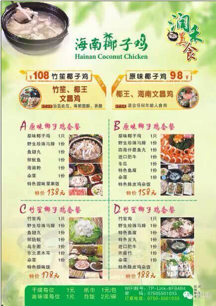 4月18日起:至6月30日:本店推出一系列优惠活动凡在本店消费海南椰子鸡火锅一律7·8折套餐除外,在本店火锅期间还免费送出一份海南养生芦荟,宵夜期间啤酒买一送一。