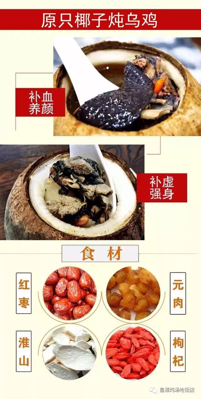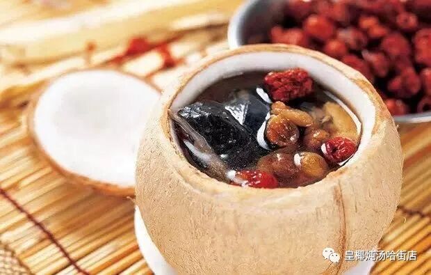 原只椰子炖乌鸡:是皇椰炖汤的招牌滋补靓汤。这道汤具有补血养颜、健体润肤,补虚强身的功效,适合四季常饮。