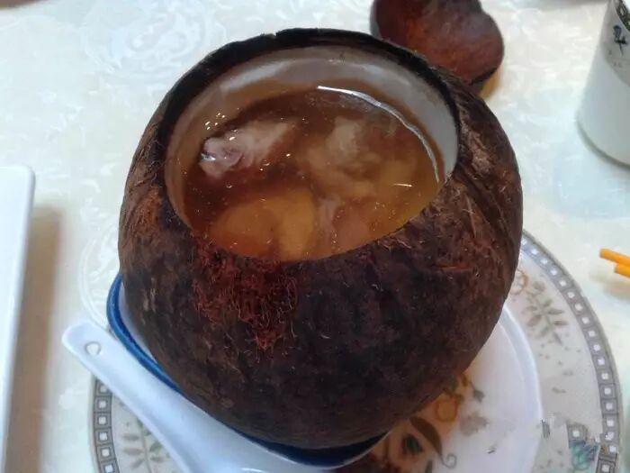 原只椰子炖鸡,以整只椰子加入滋阴补益的土鸡炖制而成的汤,讲求原材料的原味道,有“清甜”的椰子打底,土鸡肉质的鲜美,让整个炖品香气洋溢。丰富用料通过充足的火候后,浓浓的椰子香,融到汤底中去,立即让滋补的汤多了份清甜。喝一口汤,十分香甜,本身带有椰子水的汤水则更加鲜甜,与土鸡和谐地带出讨人喜欢的温和滋润,让食客“口”不暇接。鸡肉清炖之后,亦都带有汤汁的清香,肉质也瞬时变得相当浓郁。再者,土鸡具有滋阴清热补益肝肾健脾止泻的功效,养阴退热益气配以能益气生津养颜的椰子,合二为一,形成的汤水清补益气,滋补养颜。