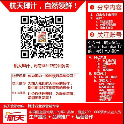 海南航天也相信,航天椰汁品牌不仅会成为中国知名品牌,在不久后的将来,也成为影响世界人群消费的世界性知名饮料品牌!而中国也不仅是制造生产商,而是制造与创造并体的商业大国!