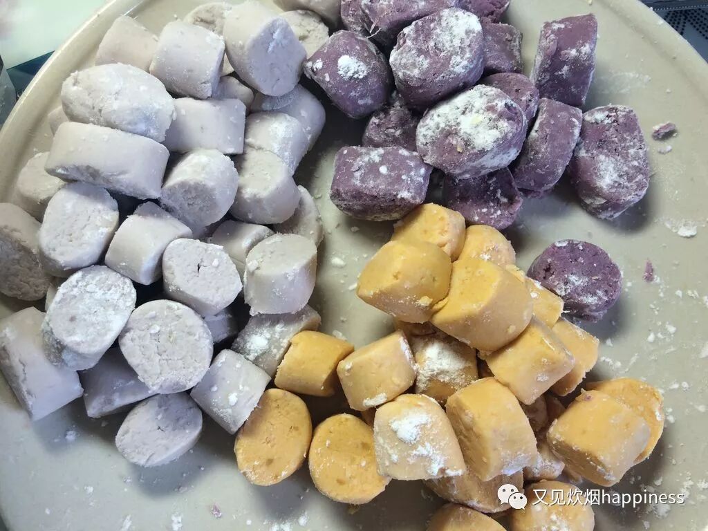 3. 取三个碗分别放蒸好的紫薯、红薯、香芋(用筷子插一下,完全软掉就好了),用手或者勺子将它们按压成泥,一定要全部变成泥,将木薯粉和三种泥按1:1混合,像和面一样和好,软度以能成形,不散掉为宜。如果想吃弹一点的建议可以增加木薯粉的用量,觉得硬的话,可以加一点椰浆。然后将面团搓成直径2-3cm的长条,在彩板上均匀撒上木薯粉,防止切好的芋圆粘连。用刀切成小块,生的芋圆就做好了~(毕竟搓一次还是挺费劲的,喜欢吃的一次可以多做一些,像饺子一样放在冰箱的-20℃动起来,想吃的时候就可以随时煮啦)当然芋圆的形状您也可以大胆发挥,公众号的头像就是自己搓的不同形状的芋圆![]()