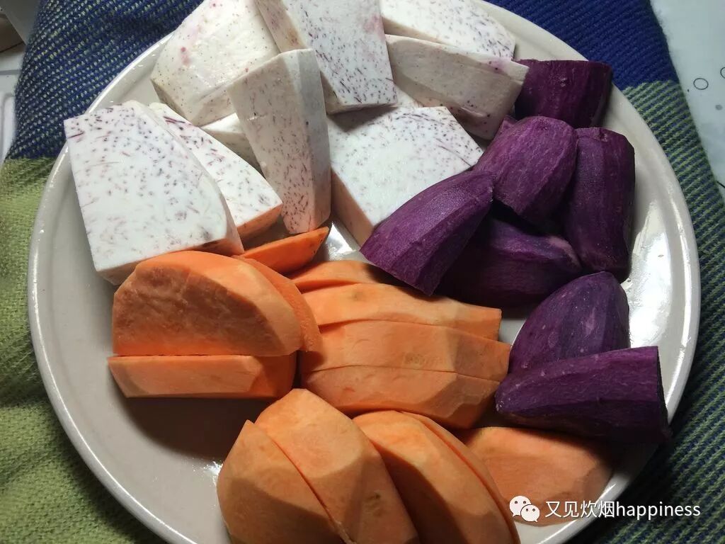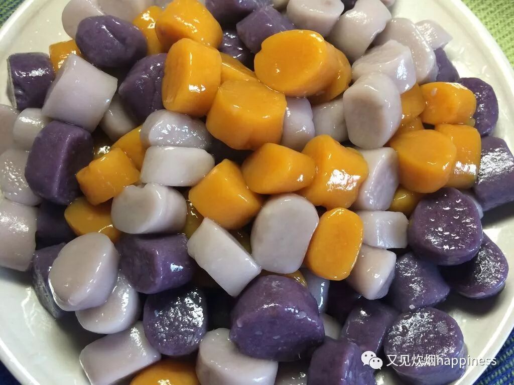 2. 将切好块的三种材料放入电饭锅中蒸熟,一定要严格分开蒸哦,不然颜色会串的,后面的芋圆就不好看啦~