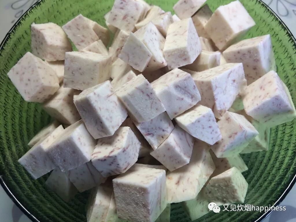 1. 将荔浦芋、紫薯、红薯(红薯要挑红心的才甜!)洗干净,去皮,切块,香芋切成如图两种大小的,四方的小块用于后面煮香芋西米露用。
