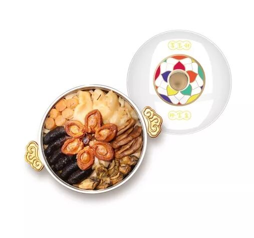 盆菜所用配汁是花园独家熬制的鲍鱼汁,选用老鸡,猪赤肉,猪手,猪皮,瑶柱,唐排,火腿,鸡脚炖八小时,浓香软滑,香气四溢。