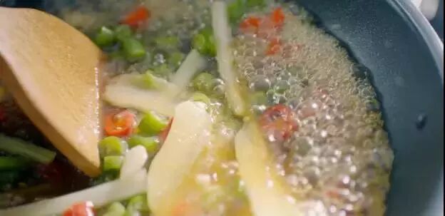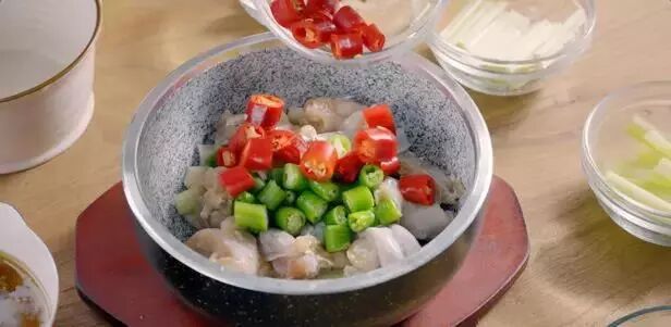 加热好的石锅内放入大蒜,加入牛蛙、莴笋和芹菜,最后再加入辣椒。