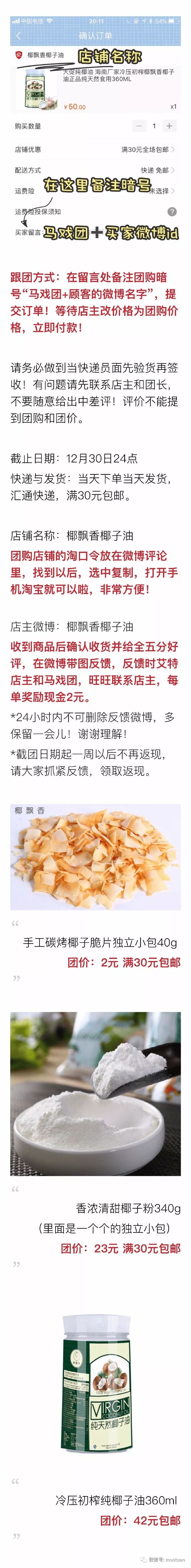 团价:椰子片40g 2元,椰子粉340g 23元,这两样满30元包油。椰子油360ml 42元包油。
