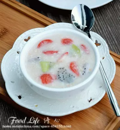 做法:把生的燕麦片加入粥煲里,加入适量清水,启动纯米粥功能。煮粥的时候把水果切成大小均匀的丁状,待剩余五分钟左右的时候,把水果从投料口加入,继续煮完即可。
