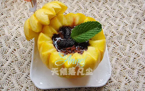 1、用雕花刀在三分之一处将太阳果切成齿状,将太阳果分成2半,用勺子将中间的籽挖出来,上锅蒸熟备用。