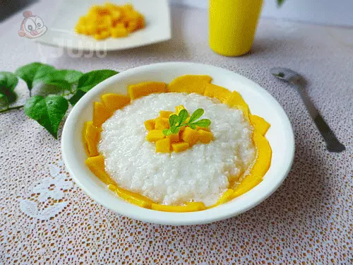 材料:糯米(适量)、椰汁(适量)、椰子粉(适量)、芒果(适量)、白糖(适量)