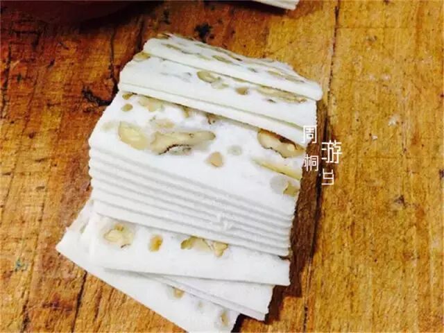 满桃片,扁形纤薄,把一格新鲜出炉的满桃片,均匀地切片。于是,这满桃片就像扇子一样缓缓展开。中间夹着的饱满新鲜的大核桃肉,也清晰可见。