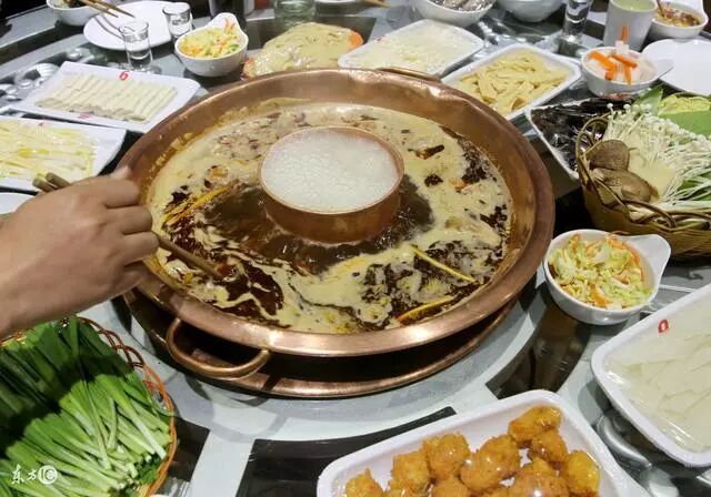 杏汁海底椰锅底,一般取南杏北杏现磨成粉,隔渣鲜炖,然后加入白贝、海底椰和适量洗净的猪肺煲开,开涮之前先喝上一两碗奶白杏香的鲜汤,顿觉神清气爽、清热去火。