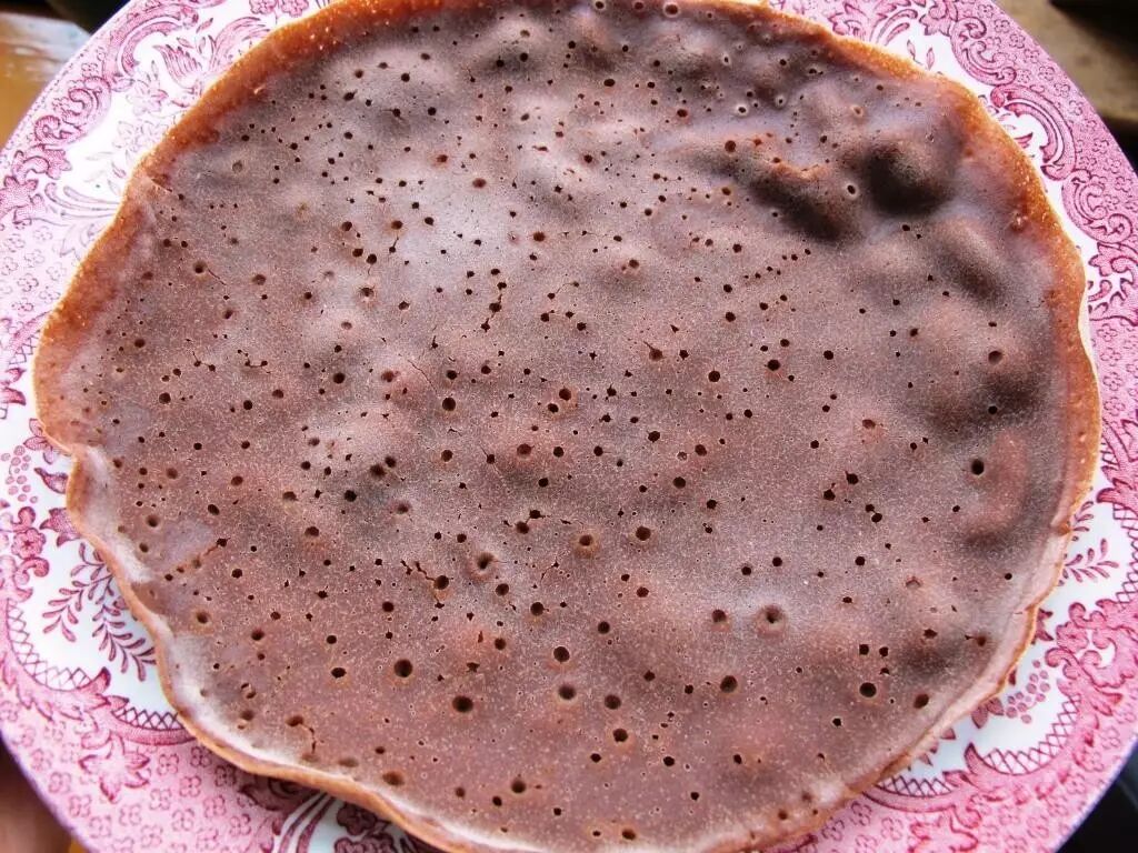 英吉拉的原料是一种叫做苔麸的小颗粒状作物,埃塞俄比亚人把这种小颗粒磨成粉,然后加水和成面,放在芦苇编的大圆筐里摊开,盖上盖子放两三天。待发酵后拿出来一蒸,就成为看起来圆圆的、闻起来嗖嗖的、摸起来软软的、吃起来酸酸的、布满小孔的大摊饼了。