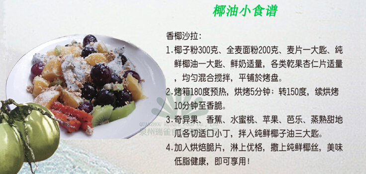 2.可添加于冷热牛奶、燕麦、甜品、热粥及热汤中,气味芳香具鲜醇天然椰果香,增加新鲜椰子油及天然高纤维之摄取量,帮助排便。