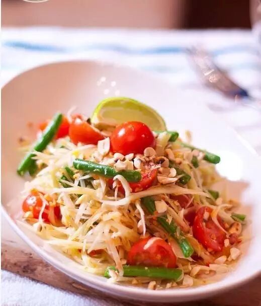 青木瓜沙拉是泰国人很喜欢的一道开胃小菜,入口酸、甜,随后以辣椒带出青木瓜的鲜脆口感,搭配生菜与花生颗粒的嚼感,让人一吃就胃口大开。不过这道菜有很多种做法,而且不仅是木瓜丝,还有黄瓜,笋都可以用同样的方法制作,最特别的是可以加米线,味道超好。但一般游客点的都是泰式青木瓜沙拉(Som Tam Thai),口味略甜,如果喜欢口味重的泰东北式木瓜沙拉,里面会加腌制的鱼酱等,还有生的小螃蟹。点这道菜时要记得,由于传统的作法都会加上鱼露、虾酱与蒜头,因此在点菜时只要特别注明这些东西不吃就行了。虽然少了虾酱与鱼露的调味,以辣椒取而代之的呛辣口感,却也让清淡的开胃菜点缀出鲜活的灵魂。
