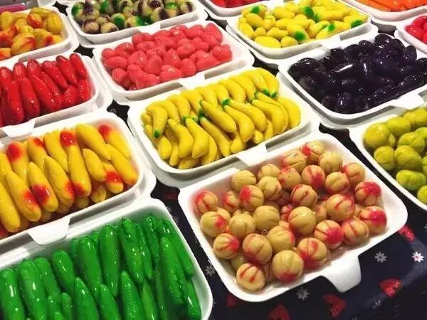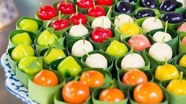 只有拇指大小,一个一个精致得让人不忍下口,里边的豆蓉绵软细腻到让人吃了第一口就根本停不下来!嚼起来有绿豆沙的香味,还夹杂着淡淡的椰奶香。其实,泰式和果子是用绿豆泥加上椰奶和糖浆,熬煮后再捏制成各种蔬果造型,干燥后,再于外部用食用色素添上五颜六色的色彩,最后镀上漂亮的琼脂。这些闪闪亮亮的颜色来自泰国的花花草草,都是纯天然的植物染料,可以放心食用。